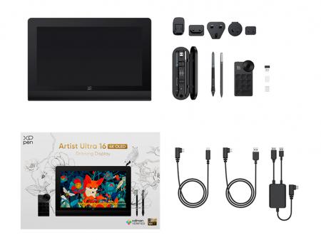 В комплект поставки Artist Ulrta 16 входит два пера с интеллектуальным чипом X3 Pro, обеспечивающими 16K уровней чувствительности к нажатию и наклон до 60 градусов. Перо X3 Pro Smart Chip оснащено двумя кнопками быстрого доступа и цифровым ластиком. Силиконовый захват пера обеспечивает комфорт для кисти руки. Перо X3 Pro Slim – тонкое и легкое, с двумя кнопками быстрого доступа и удобным местом захвата. В комплектацию дисплея помимо стандартных наконечников входят фетровые наконечники, имитирующие ощущение прикосновения пера к бумаге. Перья серии X3 Pro поддерживают распознавание ID пера. Можно настроить различные клавиши быстрого доступа в соответствии с личными потребностями. В комплекте идет пылезащищенный футляр, предназначенный для хранения двух перьев и других аксессуаров.