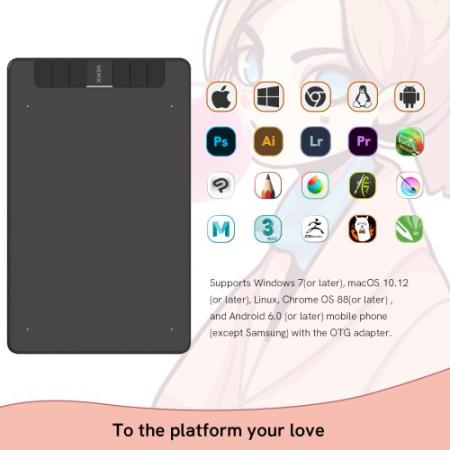 Для вашей любимой платформы : совместимо с Windows 7 и более поздними версиями, macOS 10.12 и более поздними версиями, Linux и Android 6.0 и более поздними версиями (предварительно проверьте раздел часто задаваемых вопросов по Android , чтобы узнать, поддерживает ли ваш телефон) благодаря разъёму OTG. Совместимо с большинством графических программ, таких как Photoshop, Krita, Illustrator, SAI, SketchBook Pro, Fire Alpaca, Open Canvas, Manga Studio, ibisPaint, Medibang и другими.