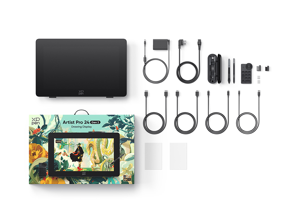 В комплект поставки Artist Pro 24 (2-го поколения) 165 Гц входит два пера с интеллектуальным чипом X3 Pro, обеспечивающими 16K уровней чувствительности к нажатию. Оба пера поддерживают наклон до 60° и скорость отклика до 200 RPS. Перо X3 Pro оснащено двумя кнопками быстрого доступа и цифровым ластиком для увеличения эффективности процесса творчества с ним. При этом силиконовый захват пера обеспечивает комфорт для кисти руки. В комплектацию дисплея помимо стандартных наконечников к этому перу входят наконечники фетровые, имитирующие ощущение прикосновения пера к бумаге. Перо X3 Pro Slim – тонкое и легкое, с двумя кнопками быстрого доступа и удобным местом захвата.