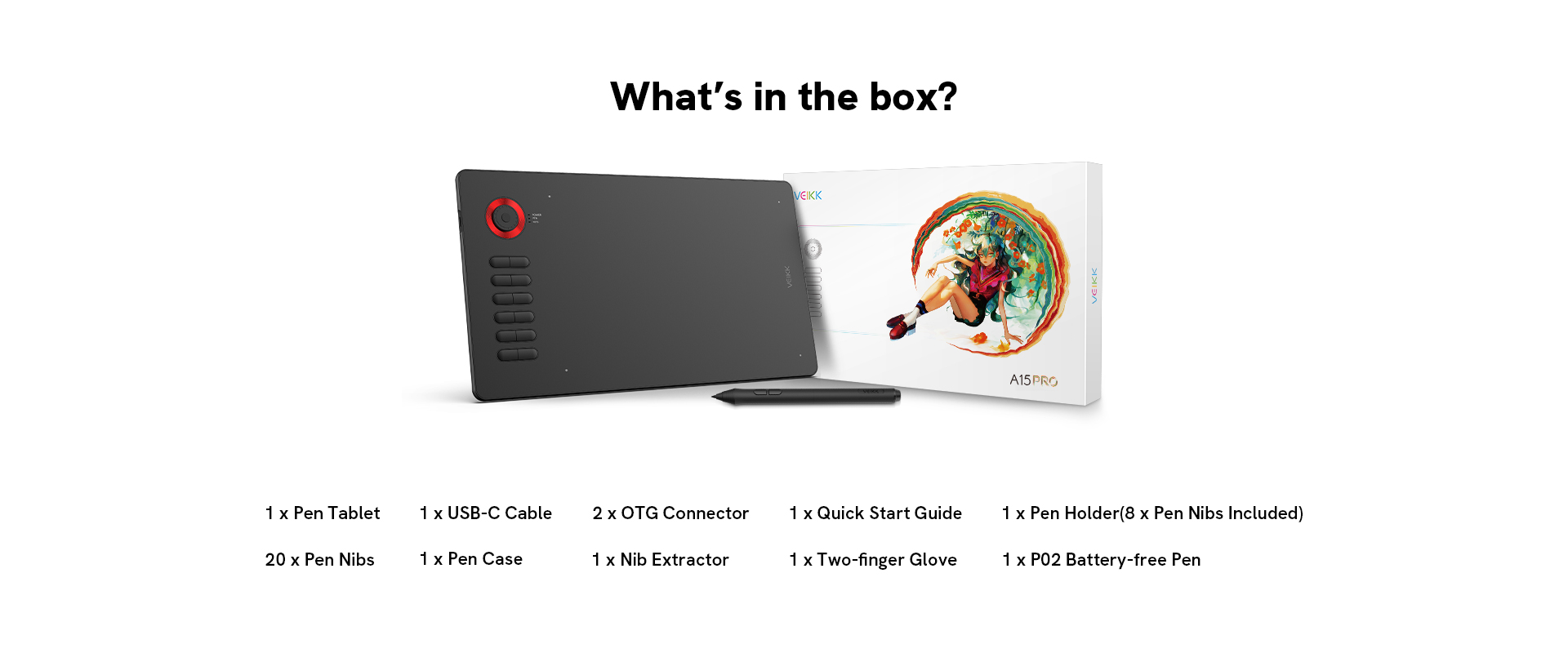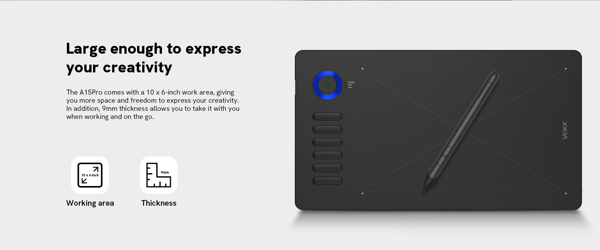 Сверхбольшая область рисования : благодаря большой активной области размером 10x6 дюймов графический планшет Veikk A15Pro предоставляет достаточно места для создания цифровых изображений. Тонкий и лёгкий корпус толщиной всего 9 мм делает его очень удобным и портативным. Кроме того, порт USB-C на этой доске для рисования обеспечивает более стабильную передачу данных.