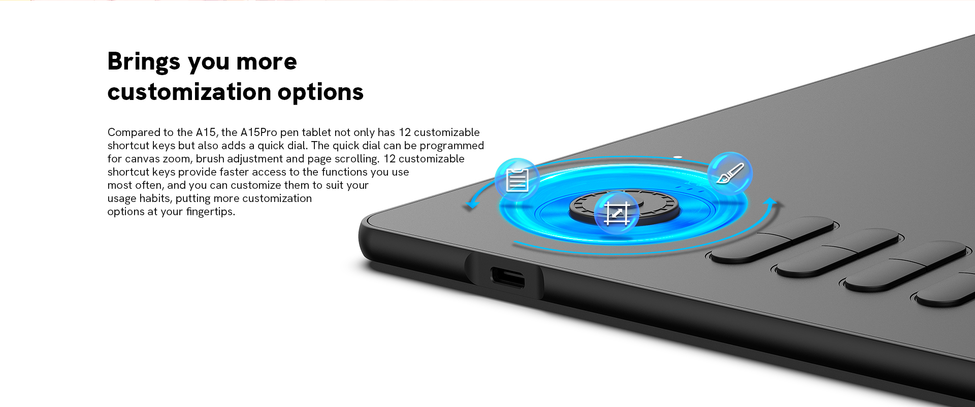 Повысьте производительность : оснащён диском быстрого доступа и 12 настраиваемыми клавишами. Диск быстрого доступа можно запрограммировать на масштабирование холста, настройку кисти и прокрутку страниц. 12 настраиваемых клавиш быстрого доступа обеспечивают быстрый доступ к часто используемым функциям и позволяют настроить их в соответствии со своими привычками. Они значительно упрощают рабочий процесс, избавляя от необходимости закрывать клавиатуру.