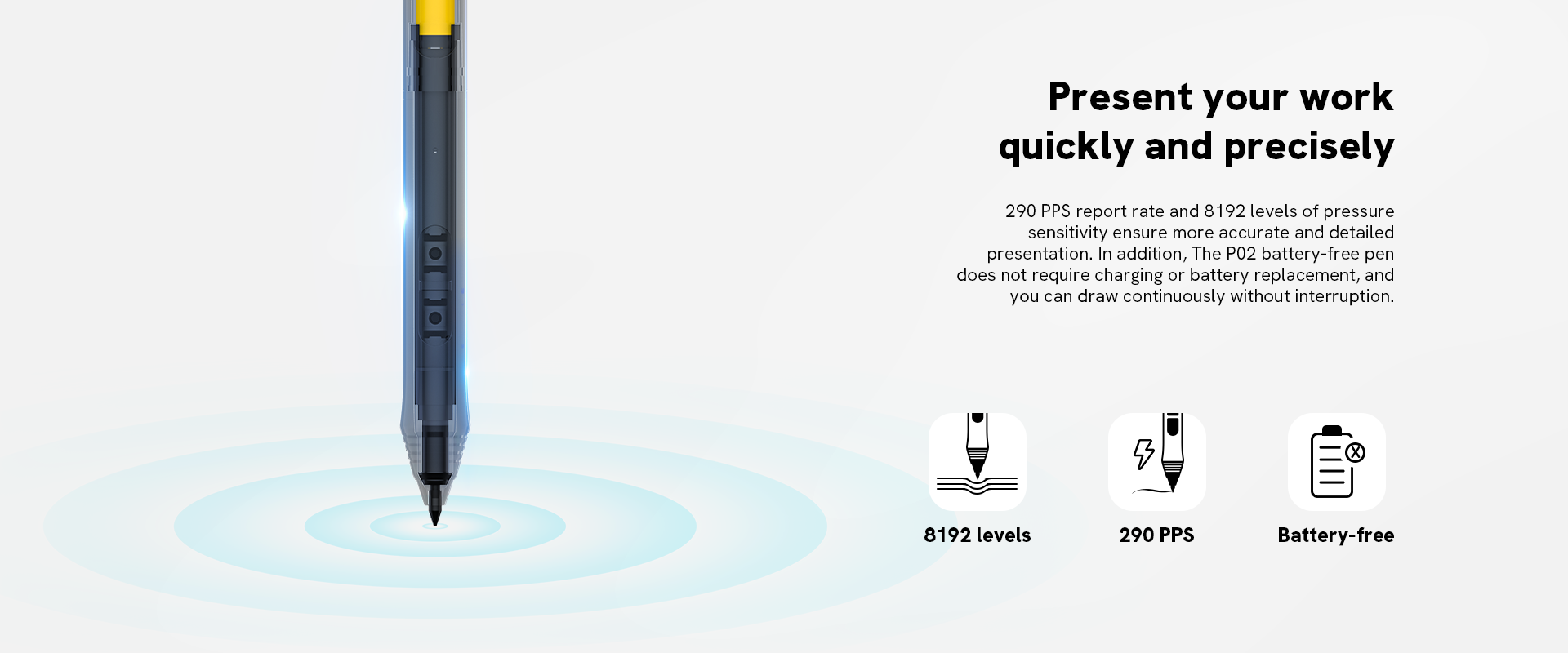 Потрясающие возможности для творчества : перо P02 без батареек имеет 8192 уровня чувствительности к нажатию, скорость отклика 290 PPS и поддерживает функцию наклона ±60°. Оно делает линии более плавными и естественными, позволяя быстрее и проще фиксировать идеи, а также работает без перерывов без подзарядки или замены батареек, обеспечивая вам незабываемые впечатления.