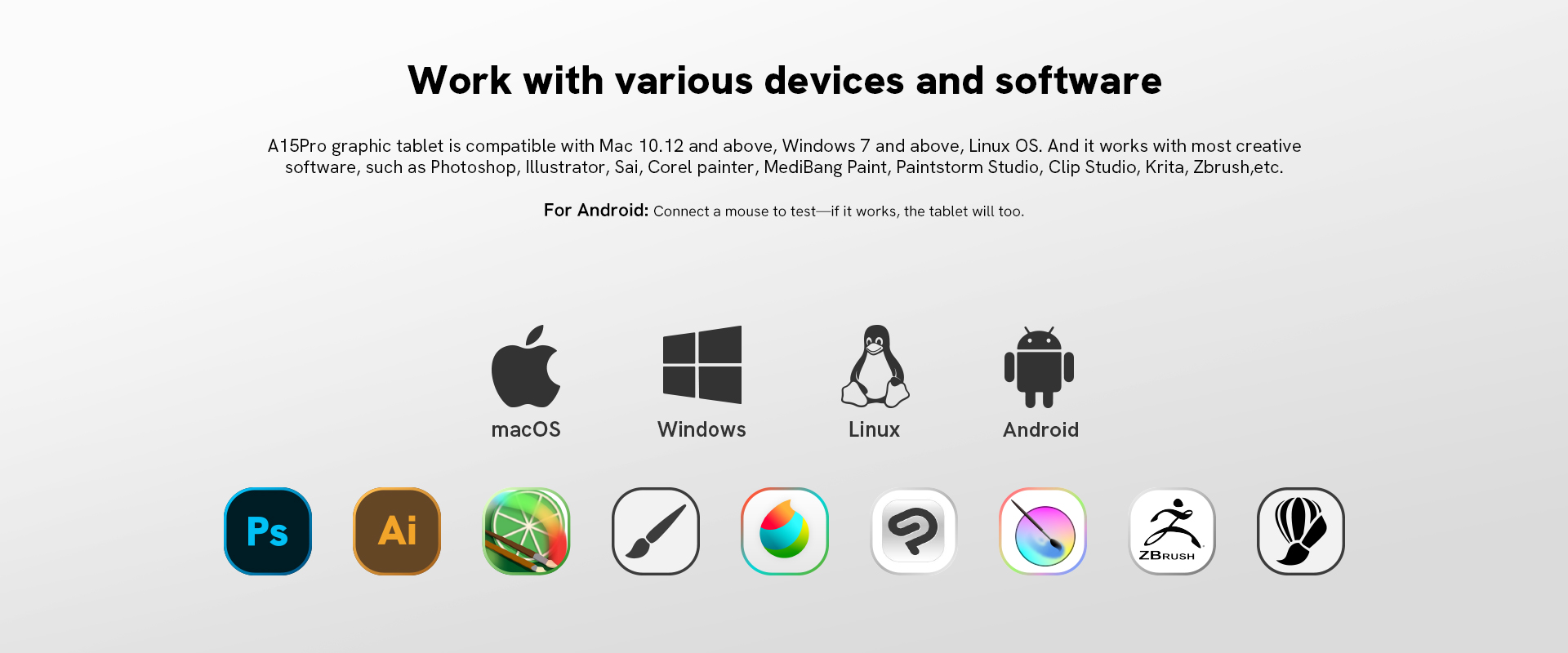 часто задаваемые вопросы по Android , чтобы узнать, поддерживает ли ваш телефон) . Работает с основными программами для дизайна, такими как Photoshop, Illustrator, Sai, Corel Painter, Comic Studio, MediBang Paint, Paintstorm Studio, Clip Studio, Krita, Zbrush и т. д.